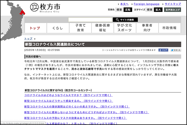 枚方市が「新型コロナウイルス関連肺炎について」を発信してる