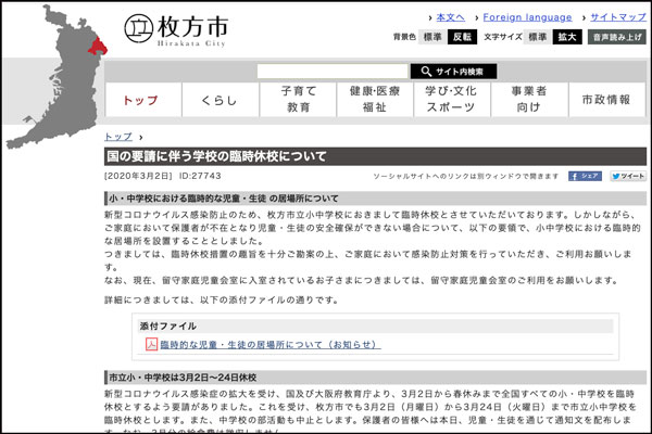 枚方市はCOVID-19の影響で臨時休校している小中学校において臨時的な場所を開設するようです。国の要請に伴う学校の臨時休校について|市役所公式サイト上記リンク先によると、開設場所は通学している小中学校。臨時的な場所を使 […] -