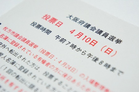 4月10日(日)に投票が行われる大阪府議会議員選挙が今日(4月1日)告示され、立候補者が発表されたので公式サイトとともに載せておきます。2011年 大阪府議会議員選挙 枚方市選挙区 立候補者★折口 勲(おりぐち いさお) […] -