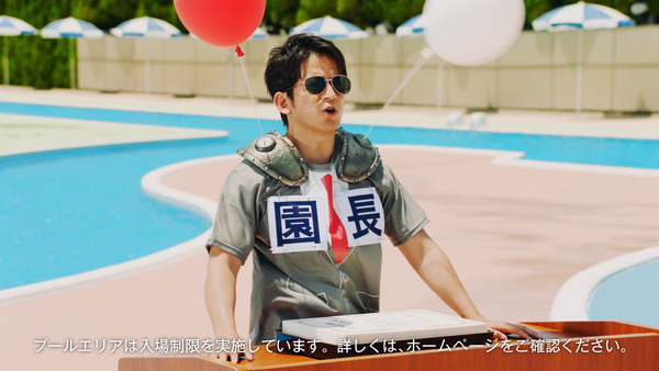 ひらパーの新CMは岡田園長が刑事になって泥棒との追跡劇。けどついついアトラクションで遊んじゃう