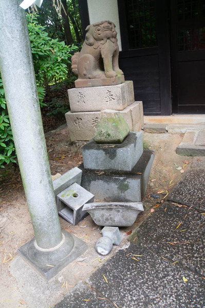 枚方市駅と枚方公園駅の間にある意賀美神社(おかみじんじゃ)の鳥居は倒壊していました。
