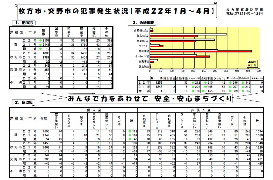 2010年1~4月分の枚方警察署管内の犯罪数がアップされていました。