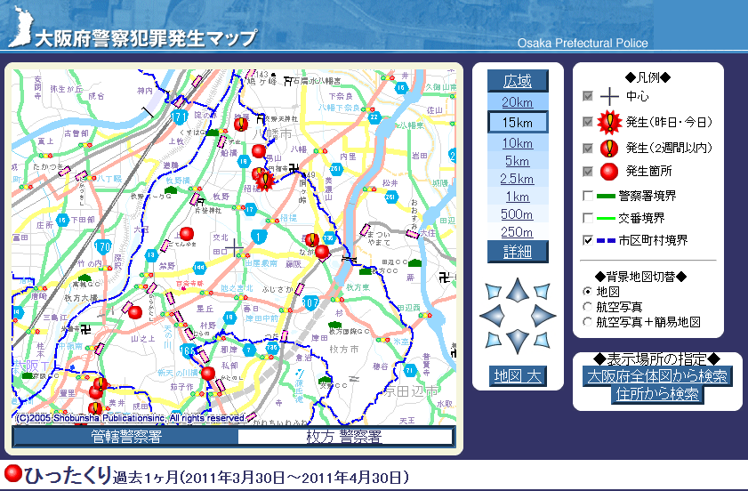 ここ数日は楠葉周辺で多めに発生してるようです。ひったくり以外に車上荒らしなどの発生マップも見れます。