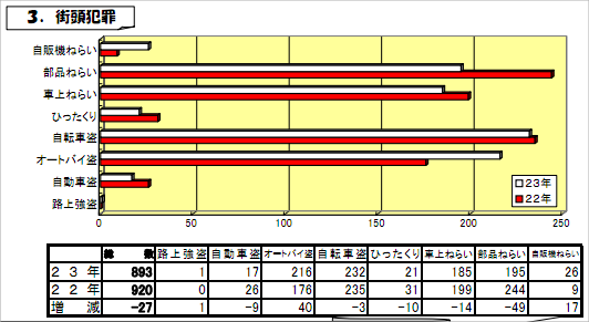2011年1月から3月の犯罪発生数の統計が枚方警察のホームページにアップされています。