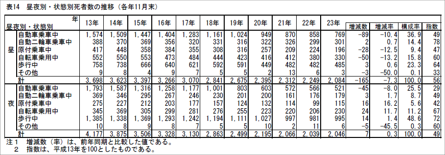 これによると昼の交通死亡事故は「自動車乗車中」の事故が769人と最も多くなっています。これが夜になると「歩行中」が995人。夜になると歩行者は特に見えにくくなるからでしょうね。