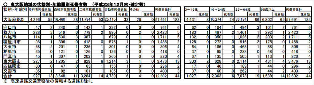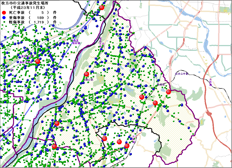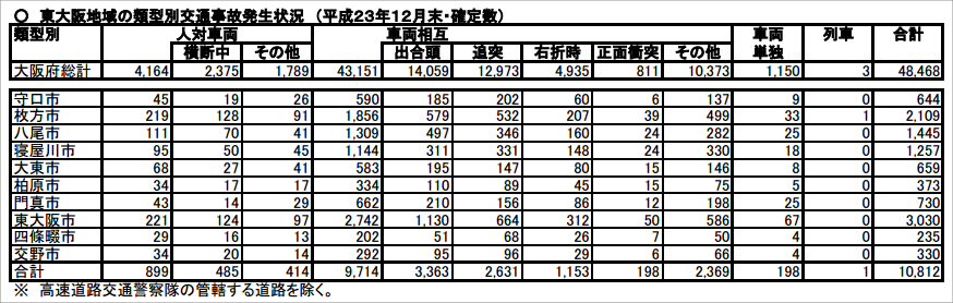 枚方での交通事故死者は5名、負傷者は2423名でした。ほか年齢別や状況別の数字が載ってます。一番多い状況は車両相互の出会い頭事故。