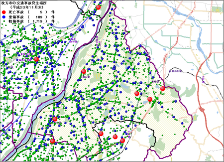 上の画像は去年の11月末までのマップになってますがそのうち更新されると思うので最新のものはリンク先で。赤が死亡事故、青が重傷事故です。数字よりもマップの位置で見たほうが「これだけの数の事故が起こっている」ということが実感しやすいですね。