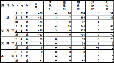2012年1月に枚方警察署管内(枚方市・交野市)で起こった犯罪の統計が枚方警察署HPにアップされています。
