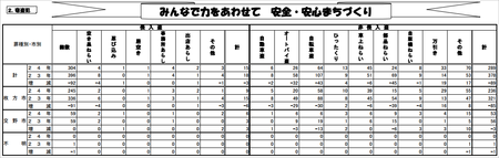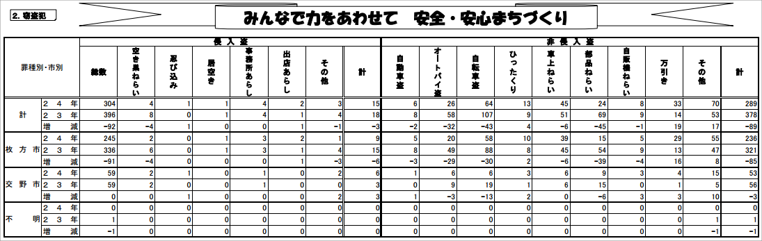 万引きが去年の14件から33件へとちょっと増えてますが窃盗犯全体としては去年の378件から今年は289件になって約24%の減少となっています。