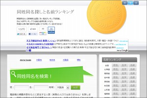 全国のランキングですが、なんと大正元年から2011年までのランキングが見れます。最近は男の子では「大翔」、女の子では「陽菜」が多く、読み方では男の子は「○○ト」、女の子は「○○ナ」というのが多いようです。たしかに最近よく聞きますね。