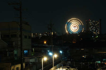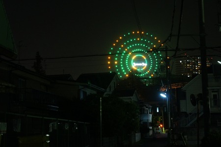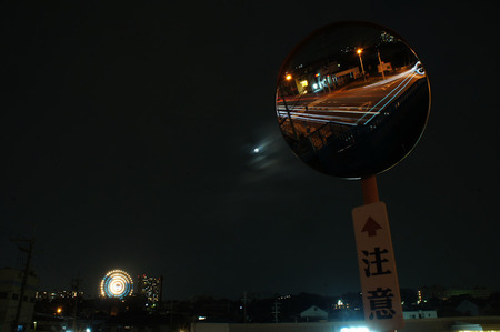 観覧車と交差点。カーブミラーの左に写ってるのはお月さんです。