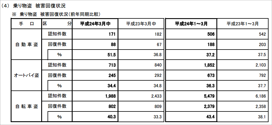 なんと自動車盗で37.2%、オートバイ盗で36.3%、自転車盗で43.4%も戻ってきてるそうです(平成24年1~3月の数値)。