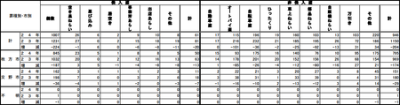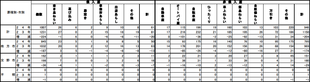 大阪府の表を載せたついでに言うと、大阪府全体のオートバイ盗の減少具合(2,103→1,852、約12%)よりも枚方の減少具合(216→115、約47%)の方がかなり大きいようです。ただ元々枚方が多すぎたんじゃないかという見方もできますけどね。