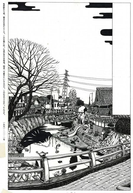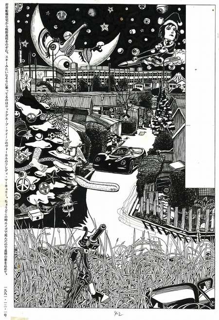 1991年12月1日号『府営船橋住宅から牧野高校をのぞむ。スキーみたいなそりに乗ってるのはロックグループ・クイーンのヴォーカルのフレディ・マーキュリー。ちょうどこの時エイズで死んだので追悼の意を込めて。』