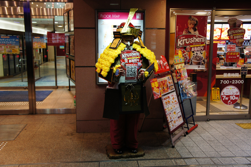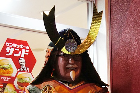 ケンタッキーフライドチキンの店頭に年中立たされているカーネル・サンダースさんが、今年もこどもの日仕様で武者コスプレをさせられています。