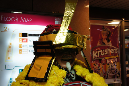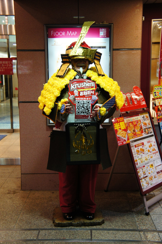 「エル枚方食遊館」だけに兜に「L」。顔が影になってて笑顔が不気味です。チキンに文句言ったら斬られそう。