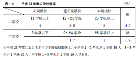 本題は今後の小中学校の学級数はどうあるべきかということについて検討した資料です。いくつか表を抜粋します。
