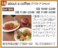 宮之阪の「アバウト ア コーヒー」のバルメニュー『激情!スパニッシュプレート 2012版』がなんだかバルに向けた闘志がみなぎってます。名前から判断してるだけですけど(笑)