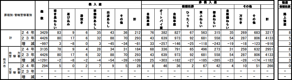 24年 → 枚方警察署・交野警察署のうち枚方市の範囲の数字(=枚方市の犯罪発生数)