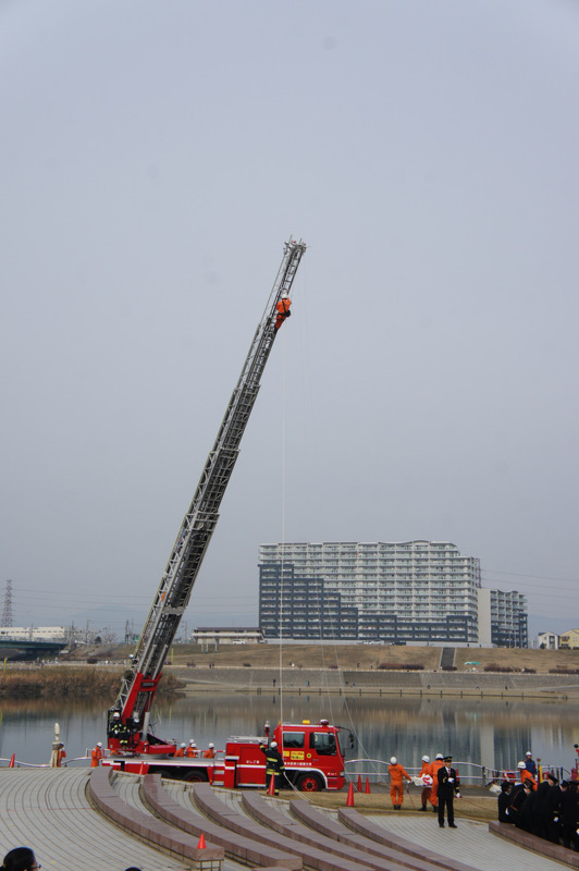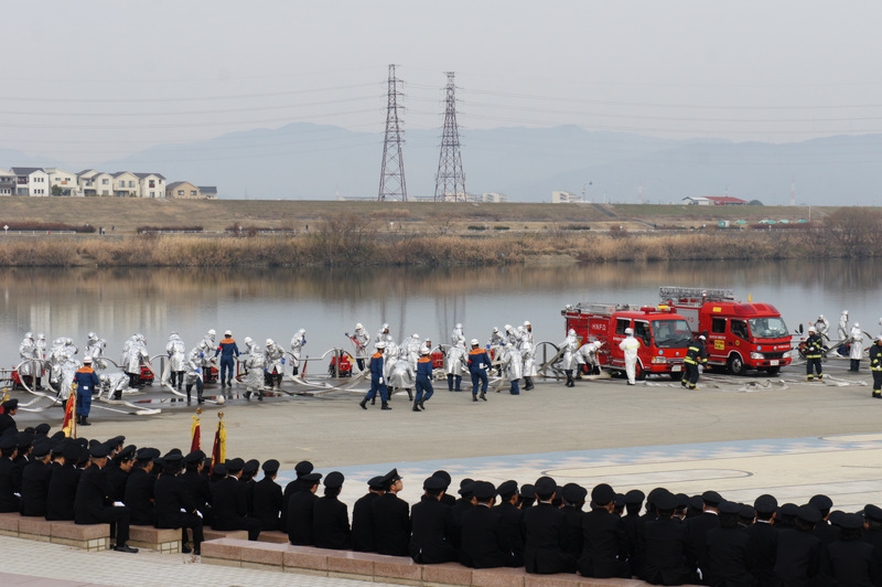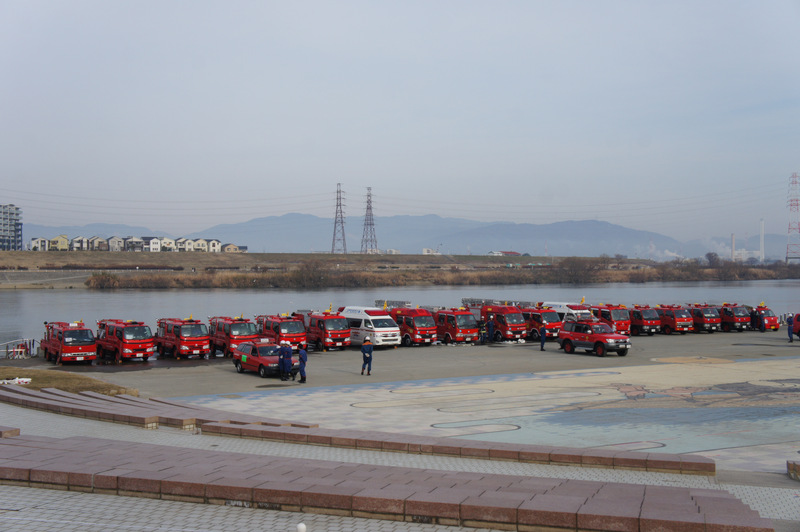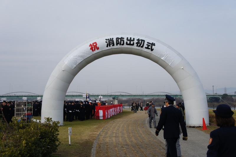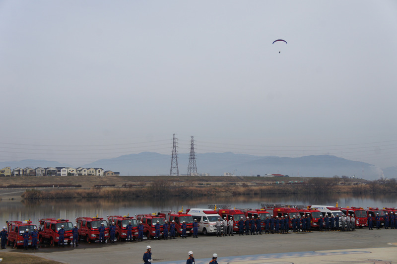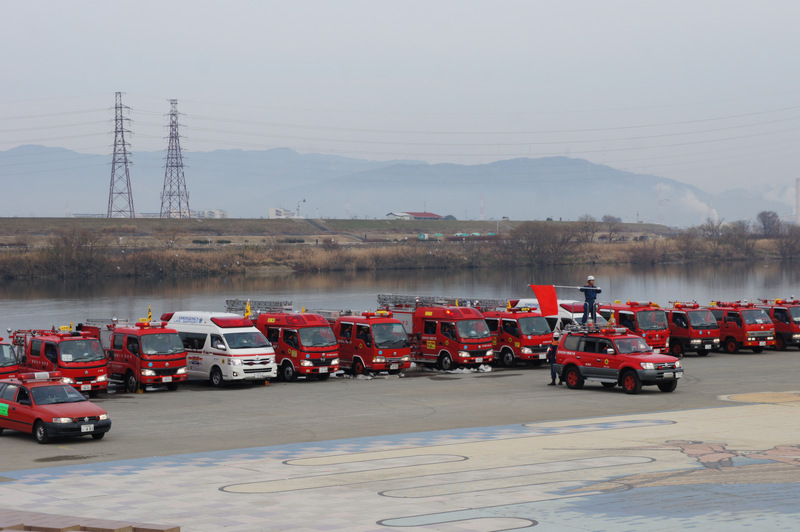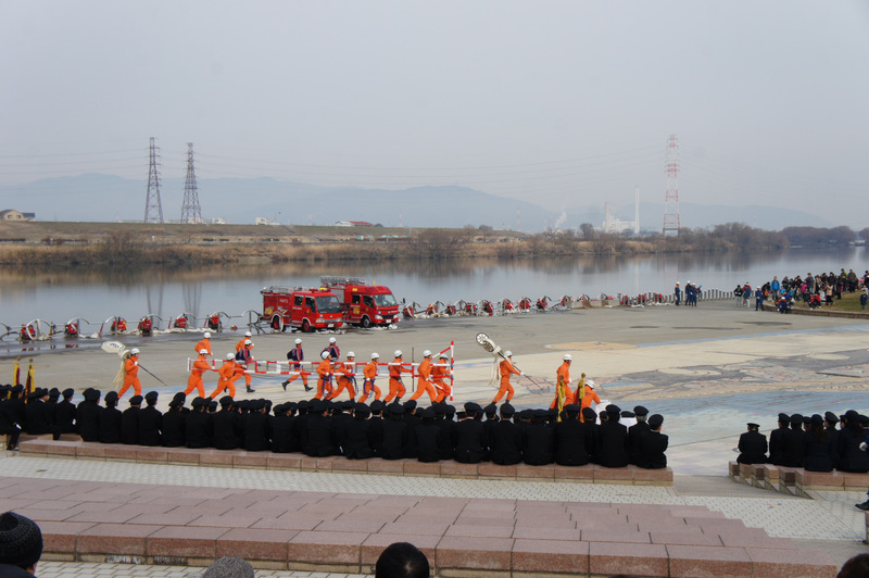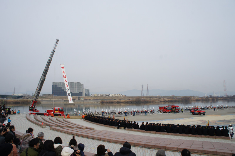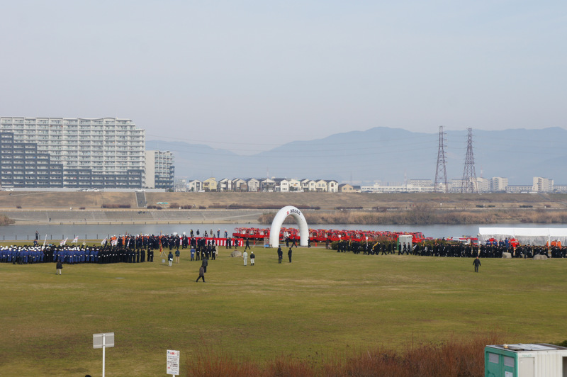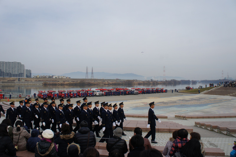今日(1月13日)の朝、淀川河川公園で枚方寝屋川消防組合の出初式(でぞめしき)が行われてました!