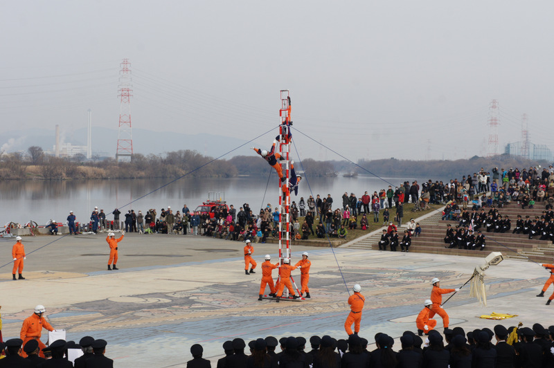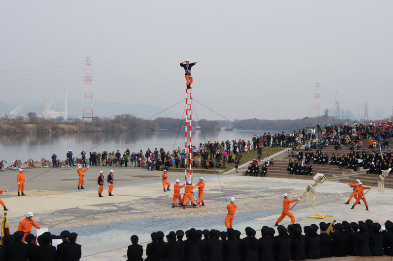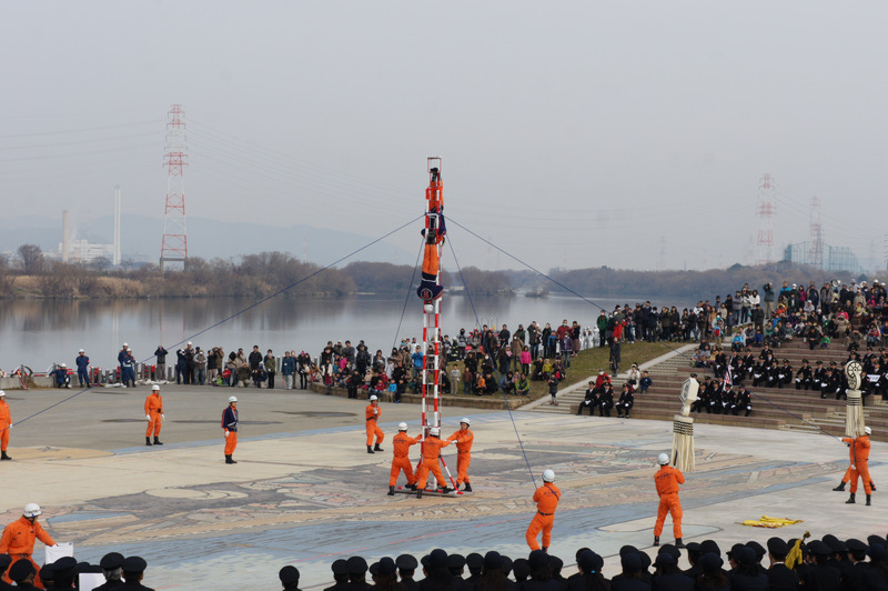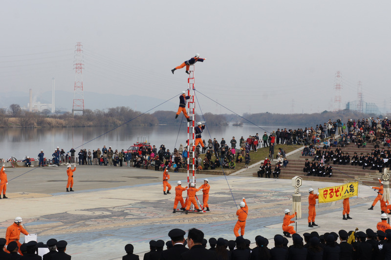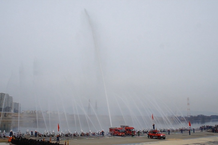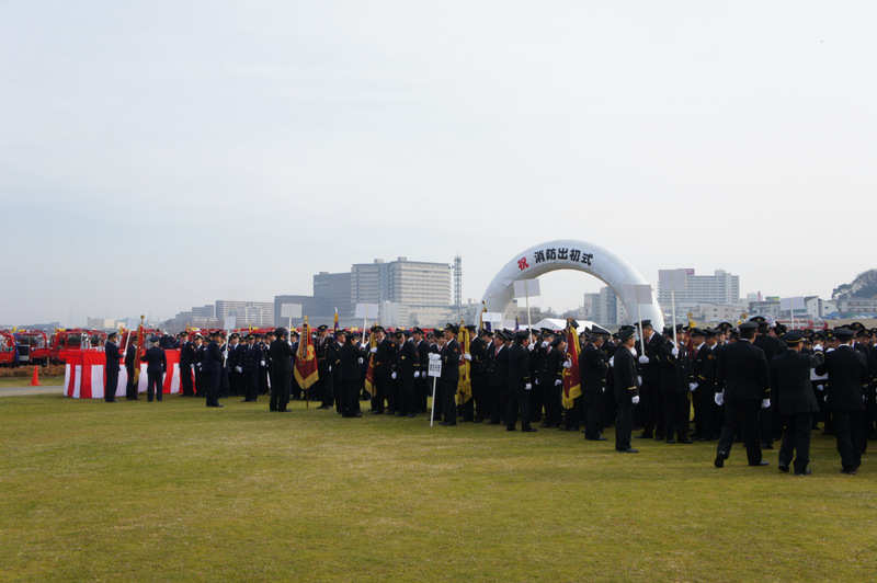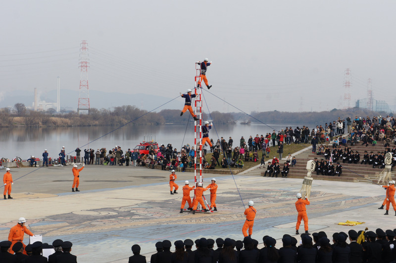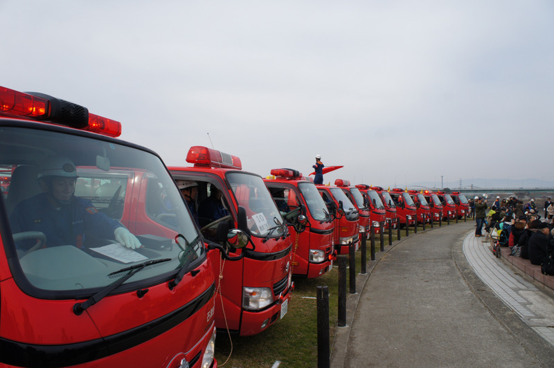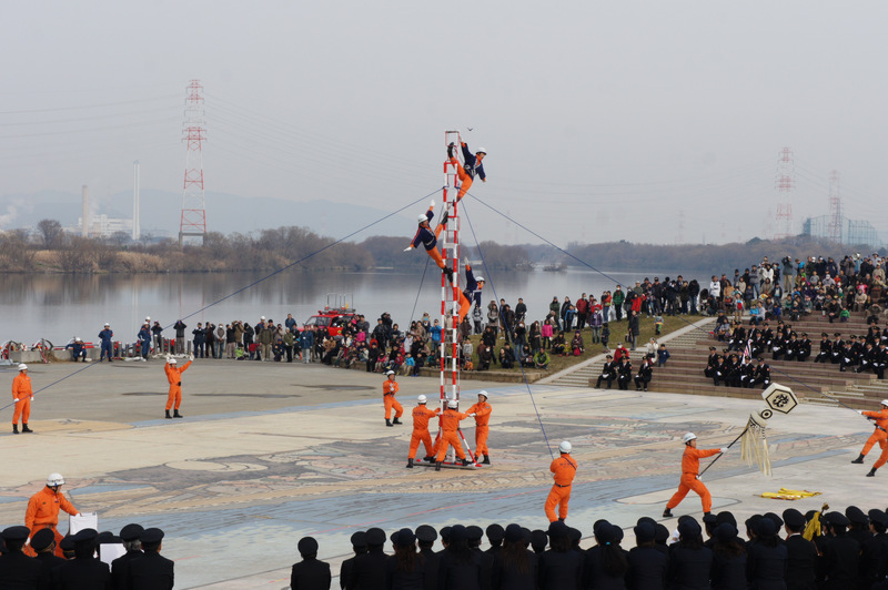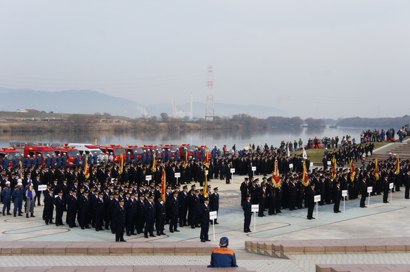 今日(1月13日)の朝、淀川河川公園で枚方寝屋川消防組合の出初式(でぞめしき)が行われてました!