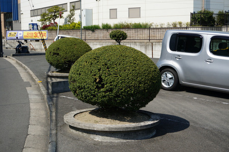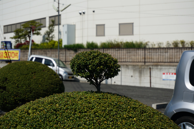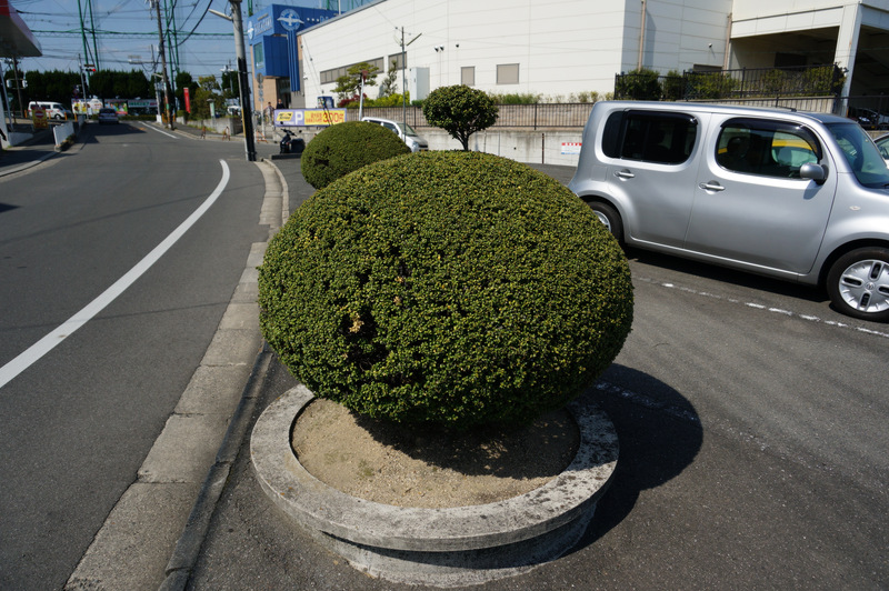 東香里のとある駐車場にちょんまげみたいな植木があります。