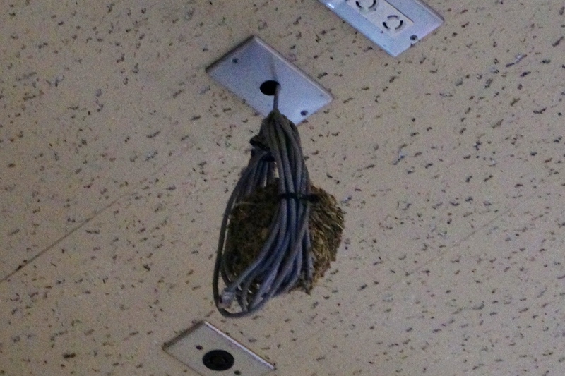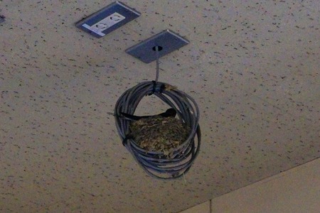 なんちゅうアクロバティックなツバメなんでしょう。「ここに巣作ったらオモロイんちゃうん」とノリで決めちゃって後悔してるパターンでしょうか。それとも「いつも軒先に作ると思ったら大間違いやで」という人間への反抗心の表れか。