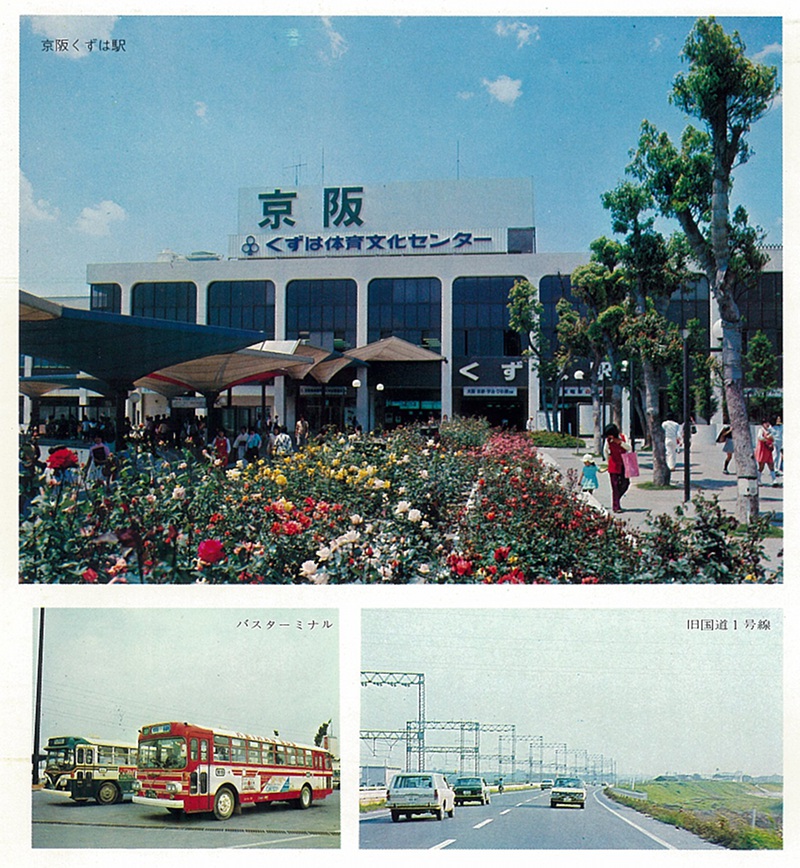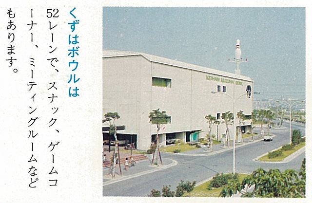 楠葉中央公園や楠葉東公園、くずはボウルの写真。くずはボウルの写真は初めて見た気がします。くずはボウルの場所は今でいうと京阪百貨店の場所で、写真の道路は駅のロータリーからタワーシティーのほうに出てきたところ(元KIDS館の前ぐらい)だと思います。