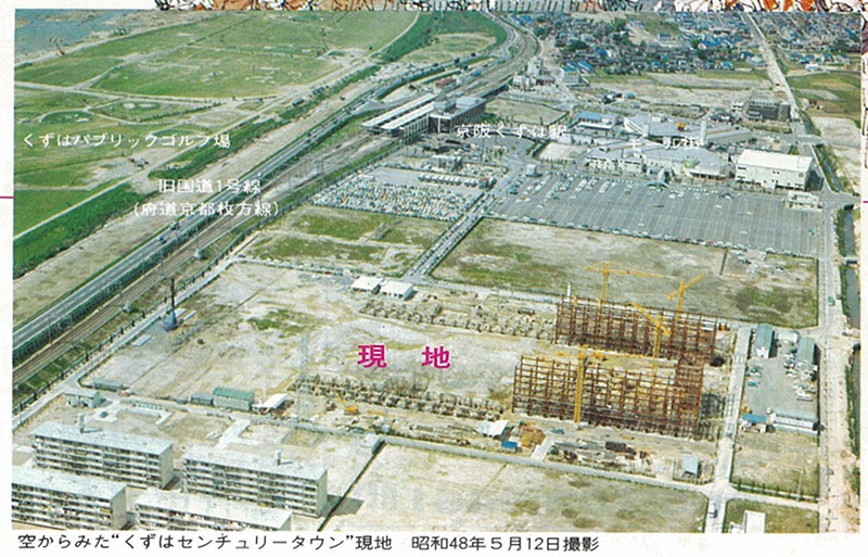 昭和48年(1973年)5月12日撮影の航空写真。「現地」と書いてあるところがくずはセンチュリータウンで、写真右上にくずはモールがあります。