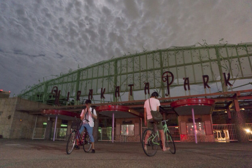 昨年夏、ひらかたパーク正門前でイングレスをするカトゥー(左)。右はひらつーで間借りしている服飾デザイナーのmgnm氏(The Attractman)