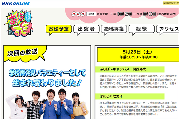 本日5月23日10時50分より放送のNHK総合「学校再発見バラエティー あほやねん すきやねん」のコーナー「ぶらぼ~キャンパス」で関西外大の特集があるようです。