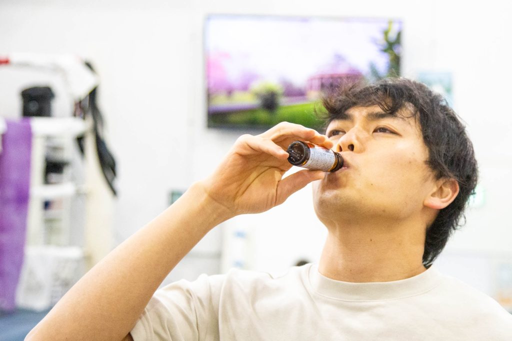 何かドリンクを手にして…