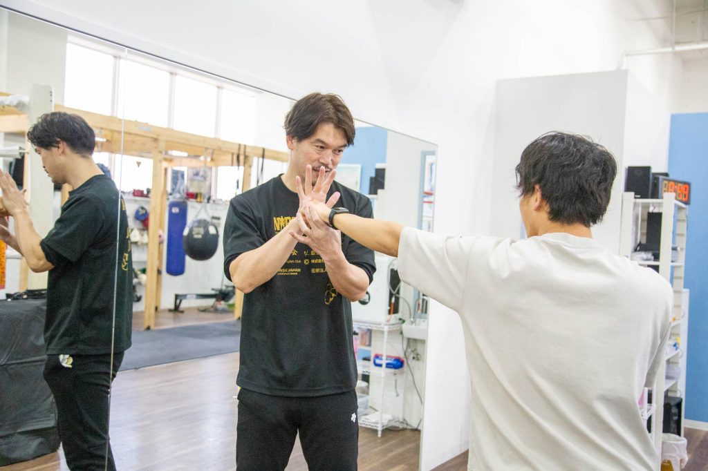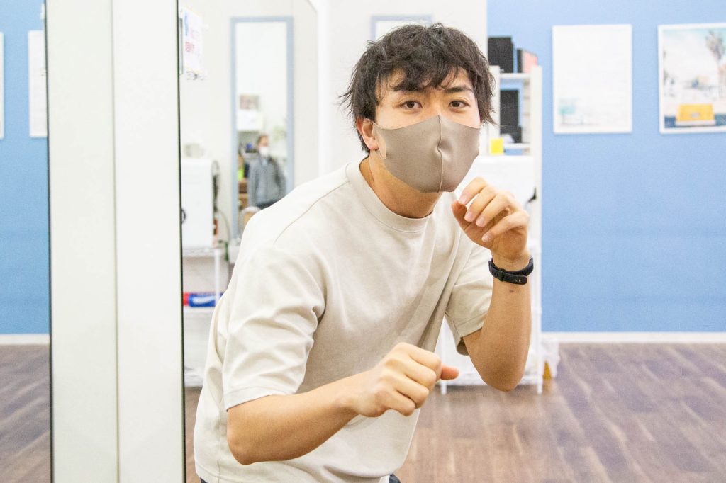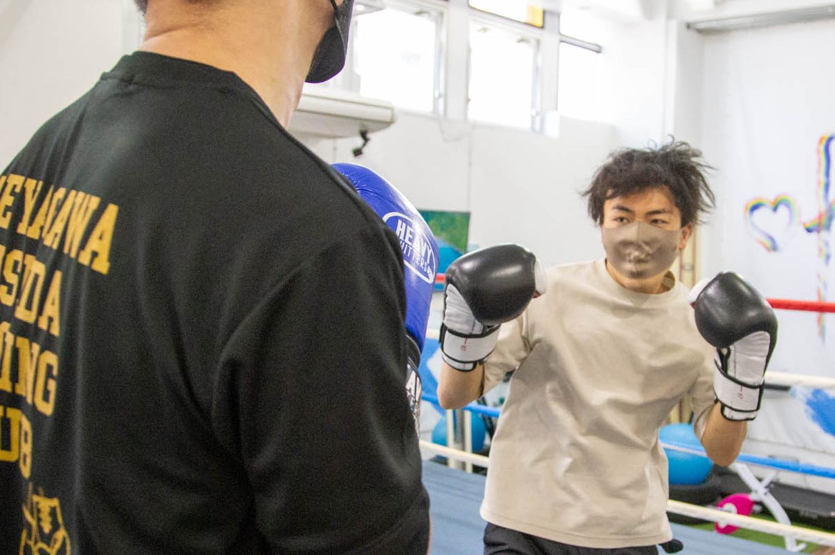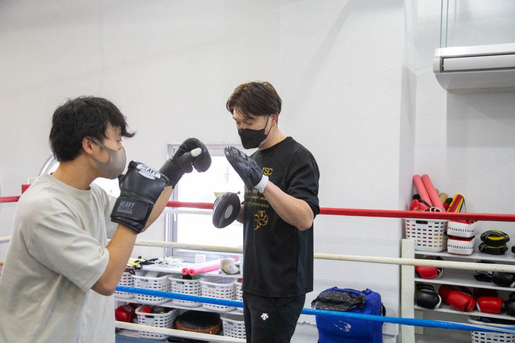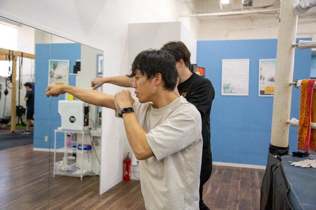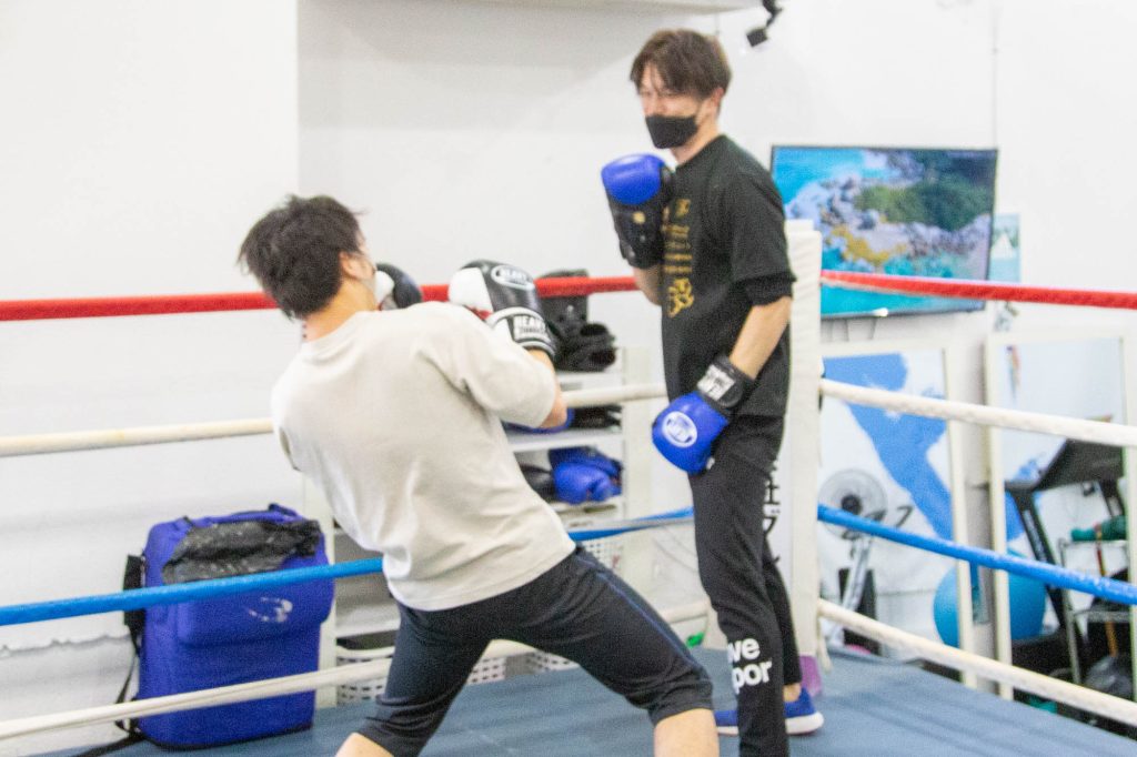 まずは素手でジャブ、ストレートのワンツーの練習。