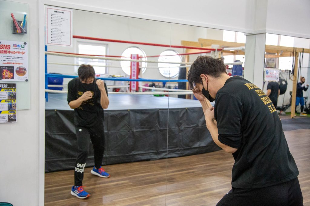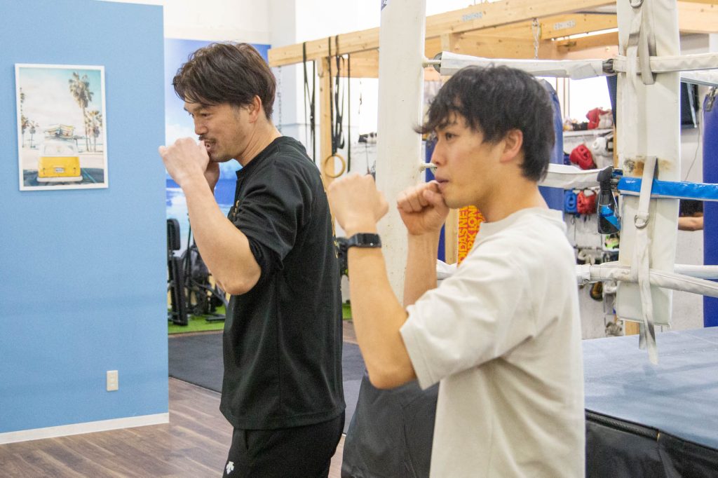 ボクシング初心者ってこともあり、ガーサンの構えがお笑いコンビ「いつもここから」のネタのポーズみたいに。