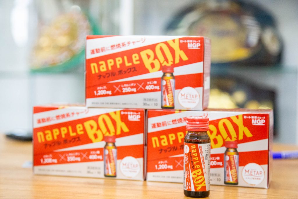 今回飲んでいるこのドリンク、ロート製薬グループエムジーファーマ株式会社(→公式サイト)からこの春、約2年ぶりに再販されることになった「ナップルボックス」というドリンク。(→公式サイト)