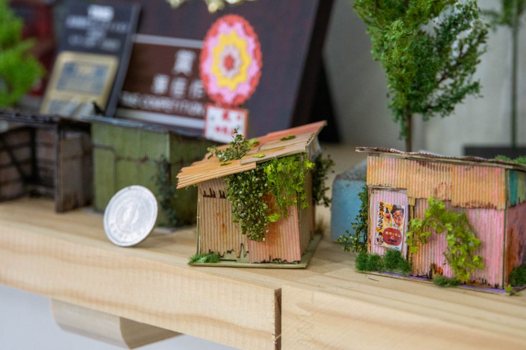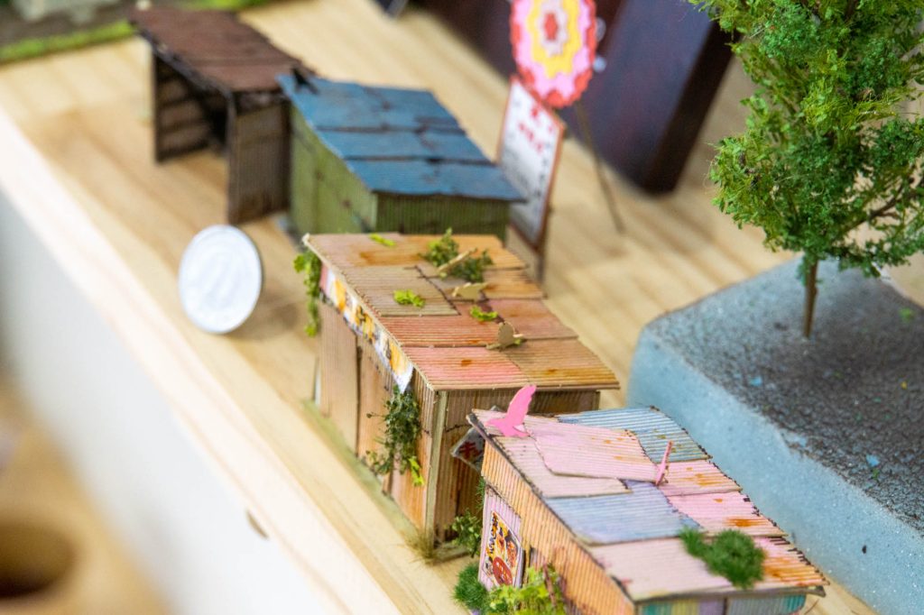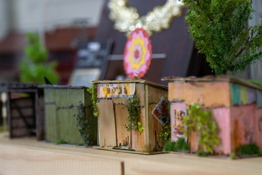こ枚の方のトタン倉庫は田中商店の看板。どうぶつの森のたぬきち商店をイメージしたんだとか。