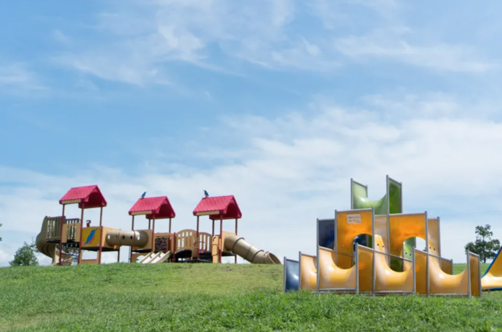芝生だけで判断したわけでなく、3分5秒あたりには山田池公園の芝生の丘の下にある遊具なども映っていたことから、山田池公園で間違いないと思われます。