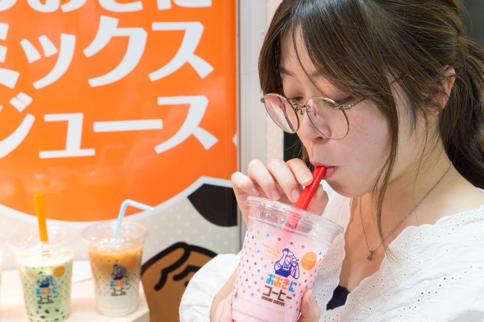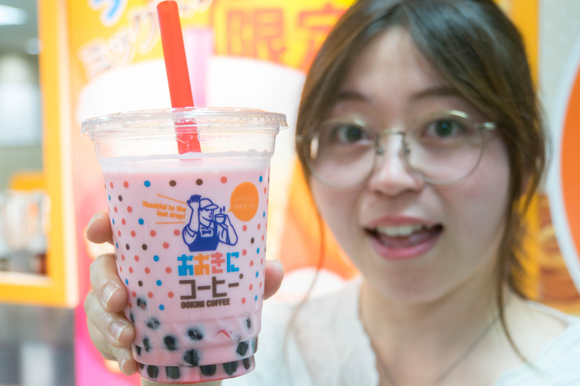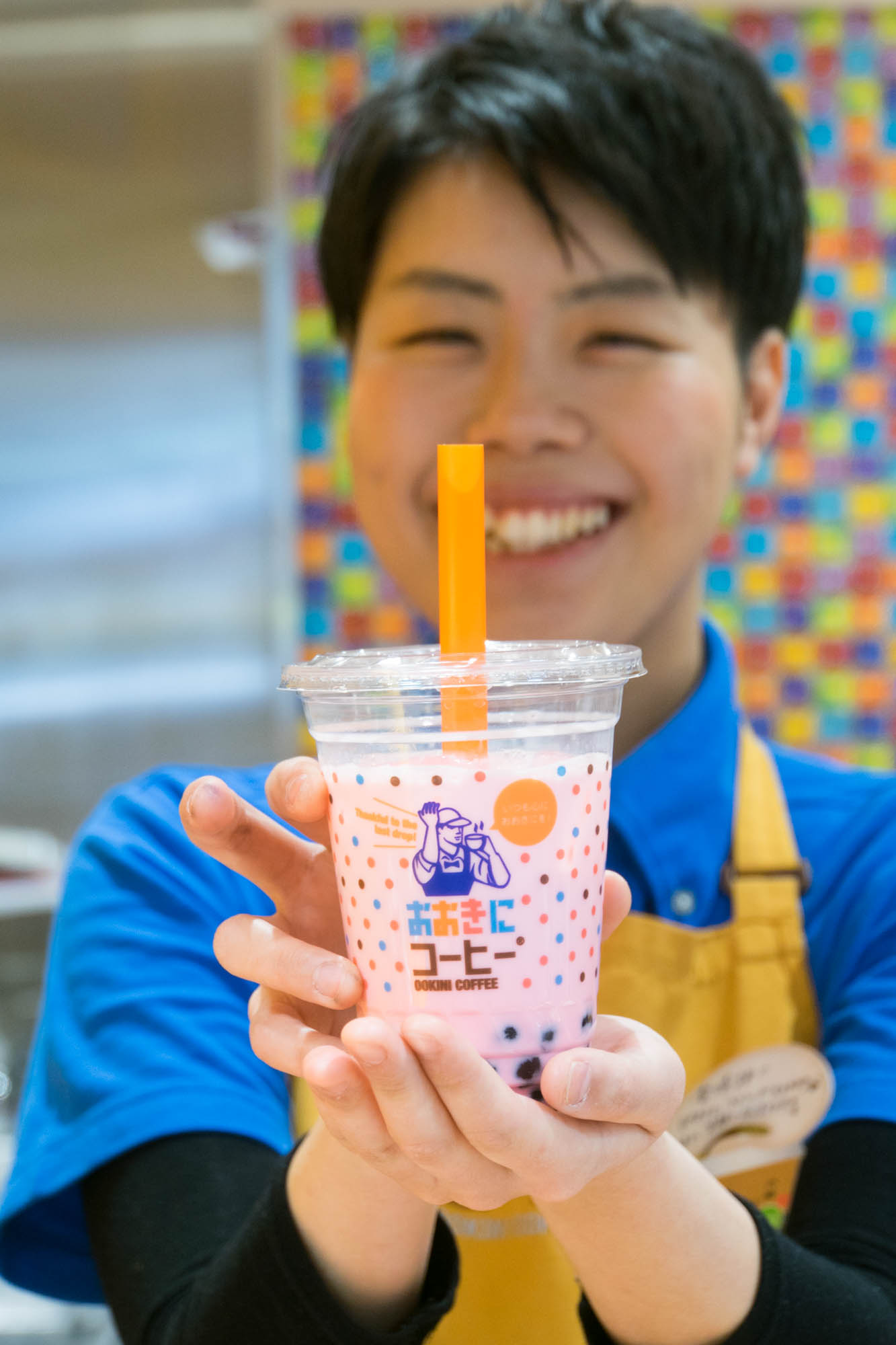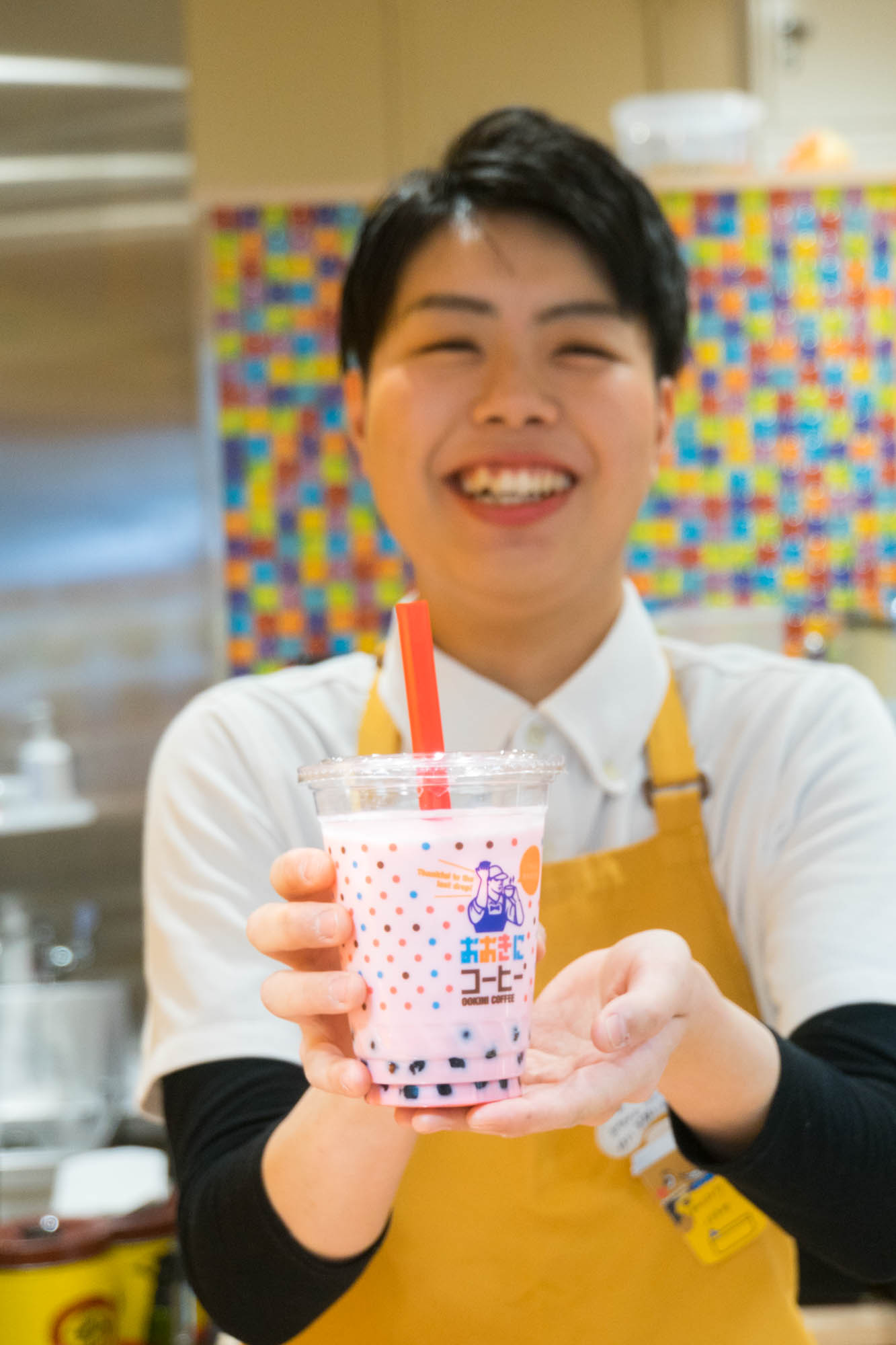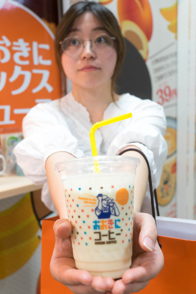 「そんなわけで、店員さんに満面の笑みで持ってもらっているこちらのドリンクが人気ナンバーワン商品!」