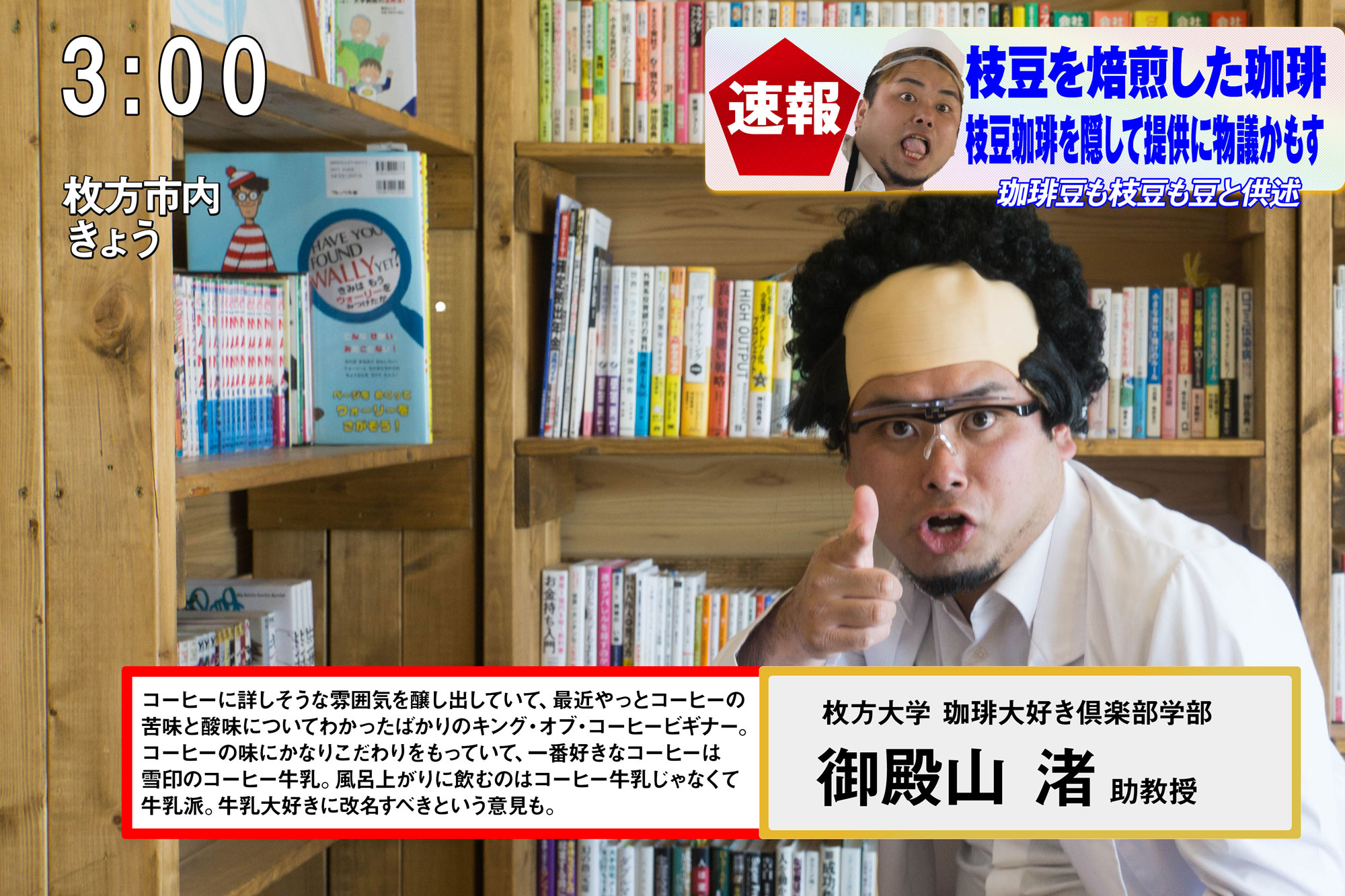 ひらつーのイメージキャラクター「お枚の方」!そして解説は自称コーヒー界の重鎮「御殿山教授」です!