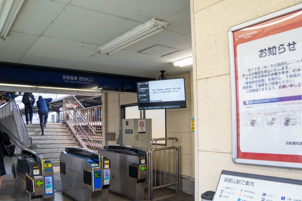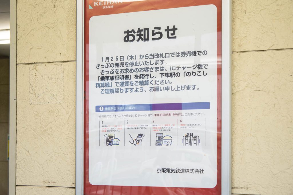 上記によると、御殿山駅の西改札口(京都方面)でのきっぷの発売が1月25日から停止されるとのこと。