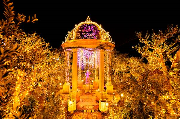 アンティークなゴールドの光に包まれたエリア。大きなキャンドルをモチーフにした「光の神殿」。ロマンティックな空間で大切な人とお過ごしいただけます。