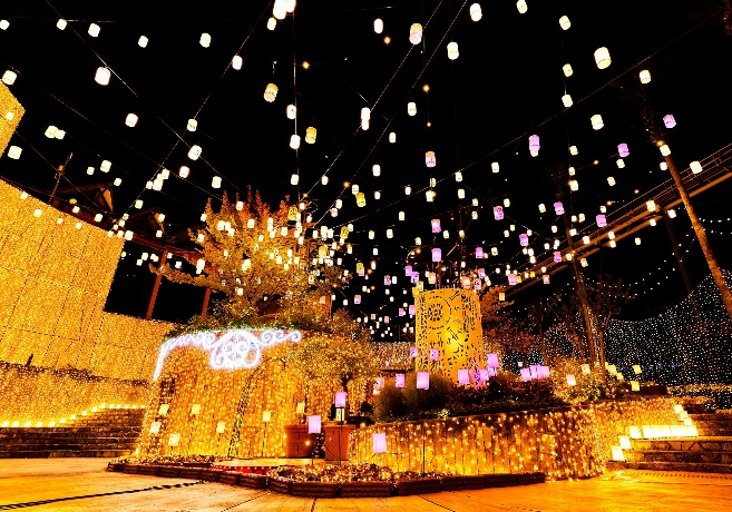 上空に浮かぶ約500灯のランタンが、ノスタルジックで暖かな光で広場を360度包みこみます。カラフルな光が踊りだすような音と光のショーは必見です。ランタンを飛ばしているような写真が撮れるフォトスポットも。