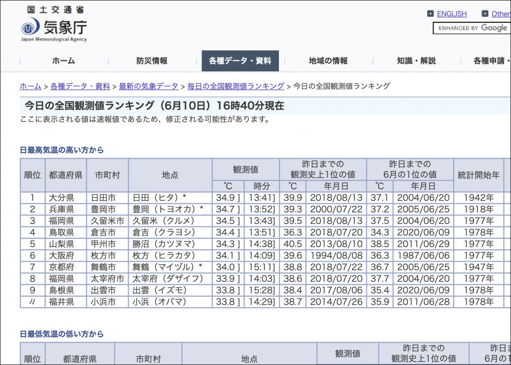 今日6月10日の枚方の最高気温は34.1度で全国6位の暑さだったようです。