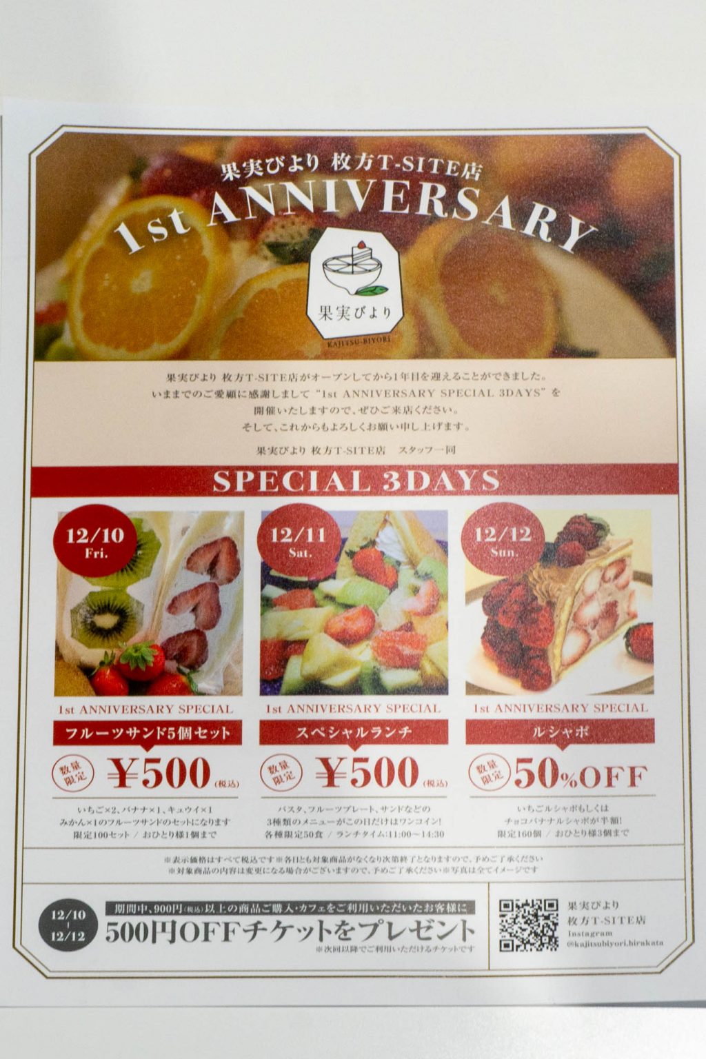 「果実びより 枚方T-SITE」がオープンしてから1周年を迎えたとのことで、12月10〜12日まで日毎に数量限定でめっちゃお得になっているようでした。
