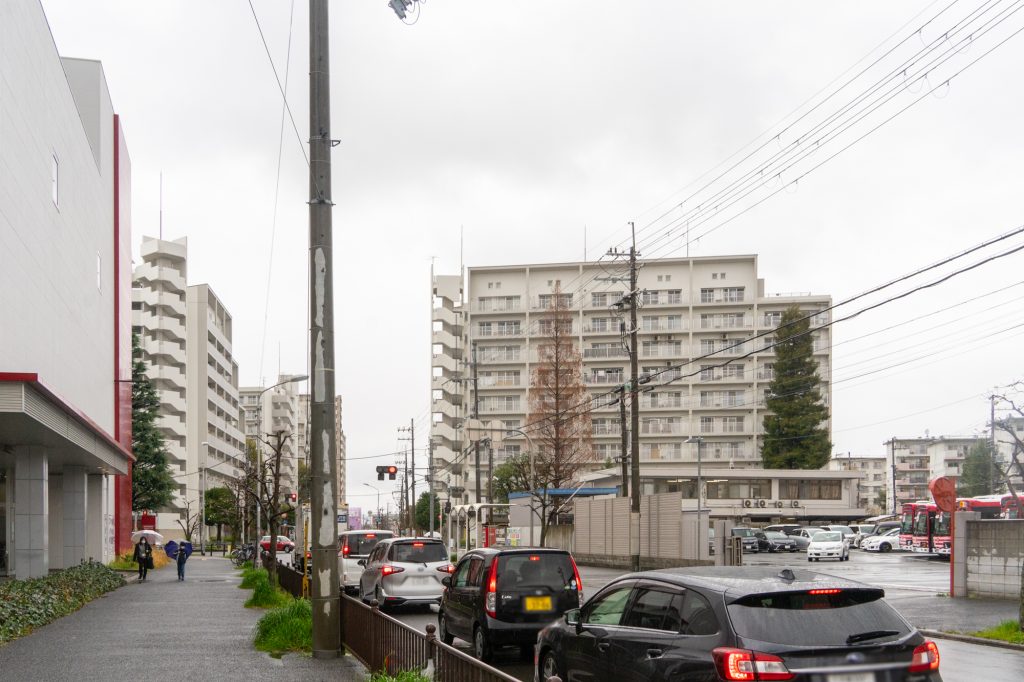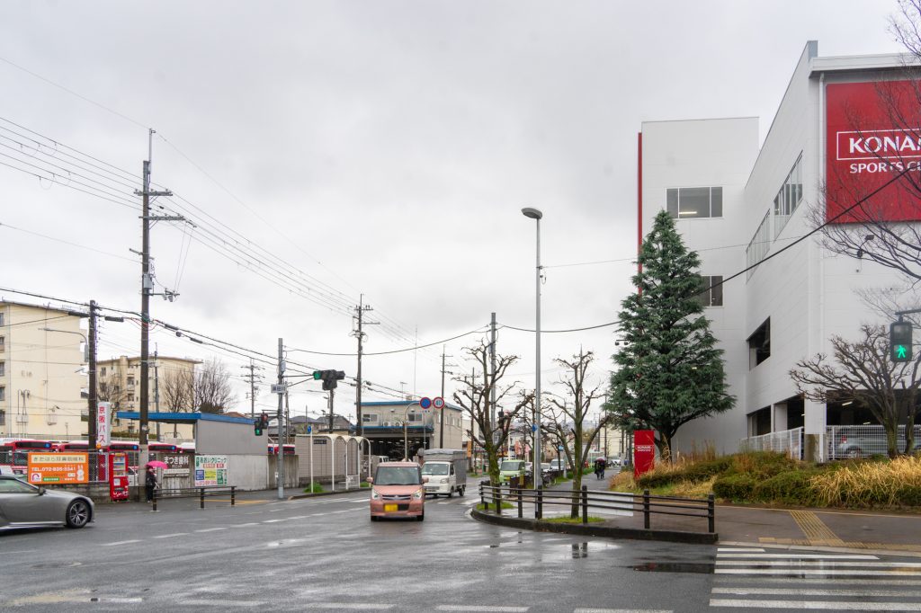 交差点「藤田川」のそばにありまして、向かいにはコナミスポーツクラブ。こっちにいくとセブンイレブンの前を通って、ENEOSがそばにある交差点「茄子作口」に出ます。