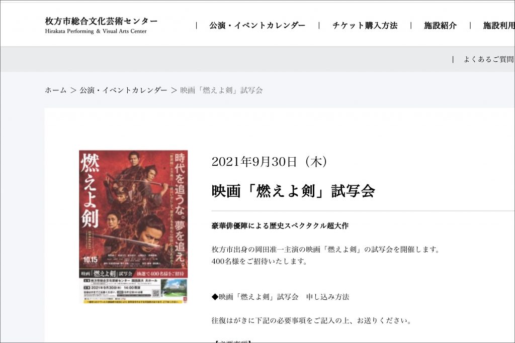 総合文化芸術センターで岡田准一さん主演の映画「燃えよ剣」の試写会が開催されるようです。