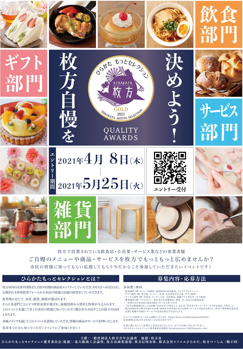 ひらかたもっとセレクションとは、これまでひらつーでも何度か記事でご紹介してきましたが、枚方市内の企業や団体が自慢のメニューや商品、サービスをエントリーして枚方市民が応援の投票をするというweb型のアワードのこと。