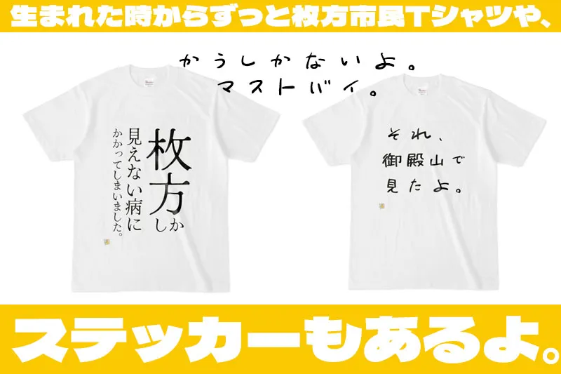 「ひらつーTシャツ」とは、枚方市民なら絶対通用するような小ネタや駅名・地名あるある、枚方ポエムなど、めっちゃローカルなネタを盛り込んだ、ついクスッと笑えるTシャツシリーズ!