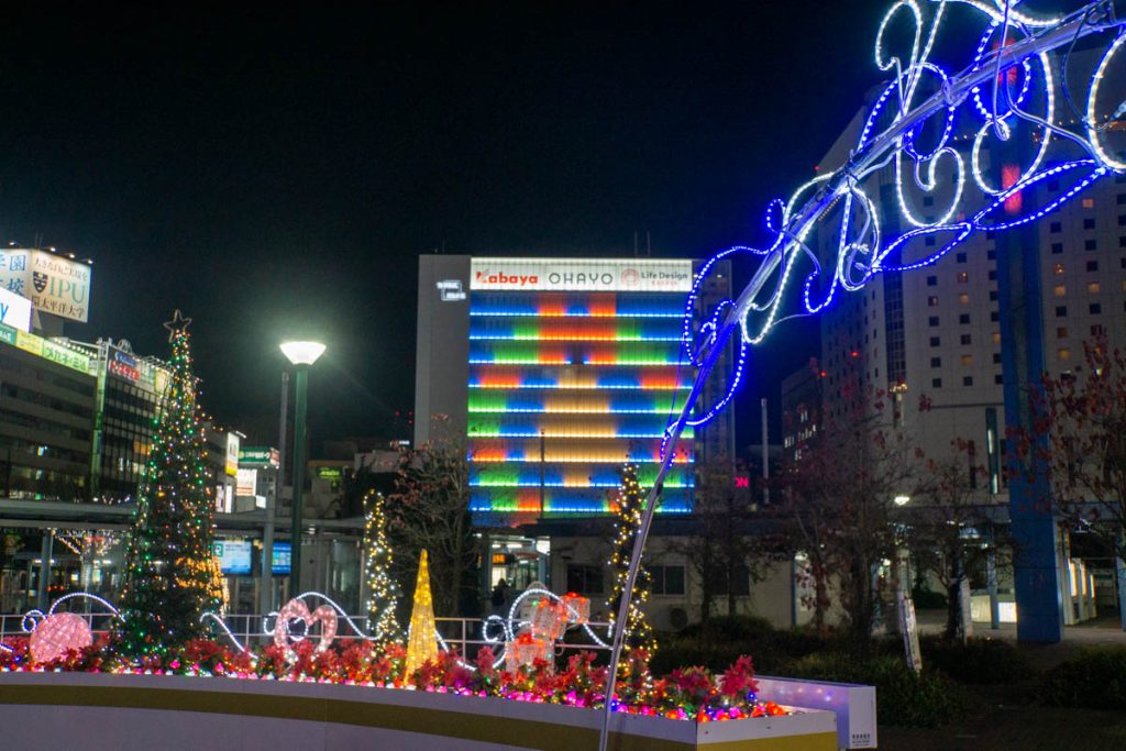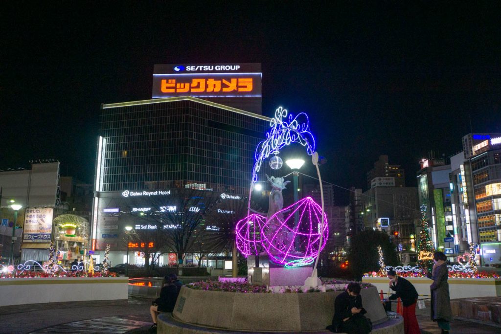 最後によった岡山駅の前にいたライトアップ桃太郎↓
