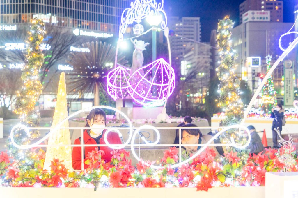 さっきのライトアップされているところ以外に、岡山駅のポストの上にも桃太郎。